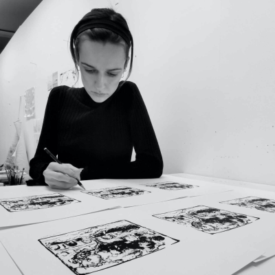 The Print and Ink piece on Canvas board sits on a burgundy wooden frame. I worked with iridescent inks so the background has a blueish hue with the light incidence angle.