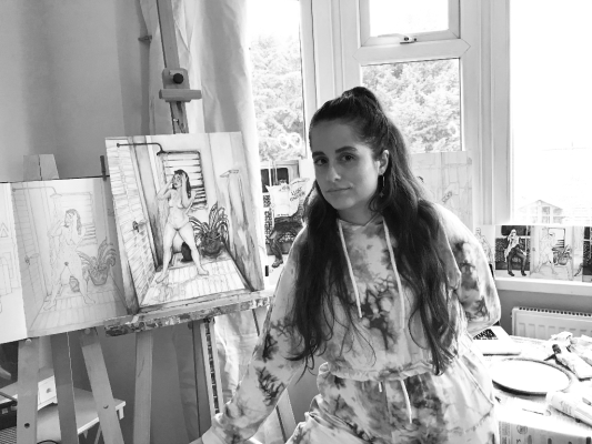 This painting was inspired by a summer’s day in London, when a gentleman stepped onto the tube with his two small dogs. There’s always something quietly joyful about seeing animals on public transport, but this particular moment lingered with me - perhaps because of the striking contrast in size between the owner and his pets. After settling in, the man gently draped a damp cloth over his French Bulldog to help it cool down. There was tenderness in his gesture. The dogs, completely at ease, lay curled beside his feet - a domestic scene yet unfolding in a public space. That small act of care, in the middle of a sweltering 40-degree day, felt deeply human and that of everyday happiness. In that moment I thought: that’s all I want in life, for someone to gently place a cool, damp cloth over me in 40 degree heat.